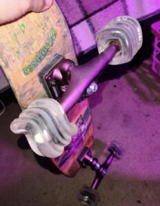But these wheels absolutely deserved the funding. They’re 2 mm smaller than my previous wheels, but are much more smooth and stable. The most notable thing to me thought are there ability to steadily roll over small patches of gravel/rock in the street, proving the eye-catching design is more than just for show and making it them the ideal wheel for cruisers. Kinda wish I’d gotten a opaque color though.